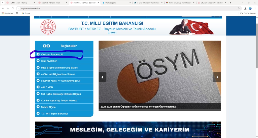 Ders öğretmenleri ile görüşmek yapmak isteyen https://bayburteml.meb.k12.tr/ adresinden Ana Sayfadaki Bağlantılar / Okuldan Randevu Al Kısmından randevu alabilir.
